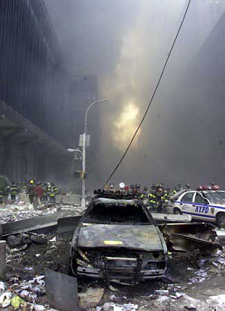 ![]() Burned cars sit outside the World Trade Center following the collapse of both towers after two planes crashed into the buildings in New York on September 11, 2001. Thousands of panicked New Yorkers poured into the streets of Manhattan, choking on white ash that billowed through a 20-block radius around the collapsed buildings. Three hijacked planes crashed into U.S. landmarks destroying both of New York's mighty twin towers and also plunging the Pentagon in Washington into flames in an unprecedented assault on key symbols of U.S. military and financial power. (Peter Morgan/Reuters) |