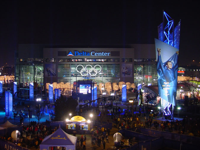 This photo was taken from the top of the bleachers a the Medals Plaza, looking out towards the Delta Center, better known as the Salt Lake Ice Arena during the Games. . .